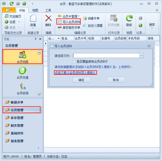 ②下載軟件中的會(huì)員檔案模板。點(diǎn)擊【會(huì)員管理】→【會(huì)員檔案】→“導(dǎo)入會(huì)員資料”→點(diǎn)擊下載《會(huì)員資料導(dǎo)入模板》,如圖: