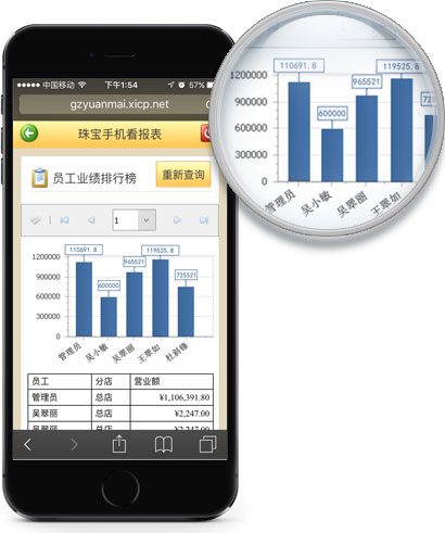 傳統的員工業績統計都是需要財務部根據員工一定時間的業績進行統計,數據容易出錯,不夠靈活化,不方便企業的管理員隨時查看員工業績情況。傲藍珠寶手機看報表管理軟件可以更好解決這些問題,系統自動將員工的業績情況分析,并通過柱型圖和表格的形式展示員工的業績。
