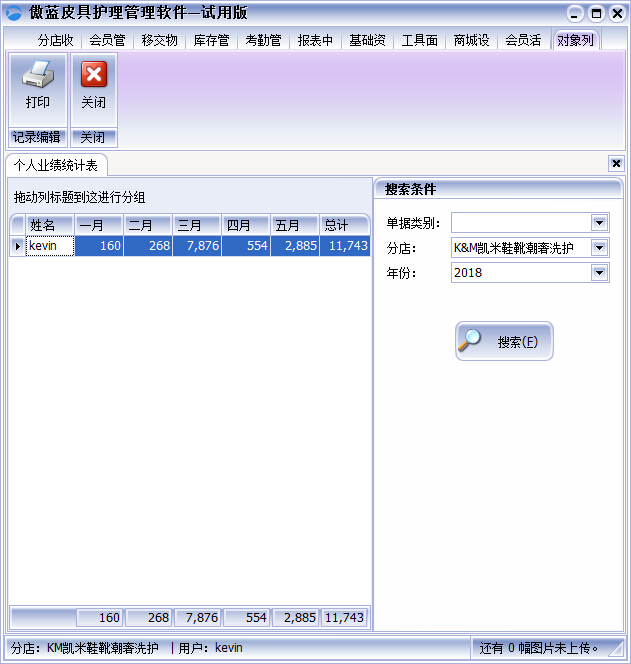 傲藍皮具護理店連鎖軟件提供個人業(yè)績統(tǒng)計報表功能,根據(jù)不同的業(yè)務類型以及門店,快速檢索員工的個人業(yè)績情況。