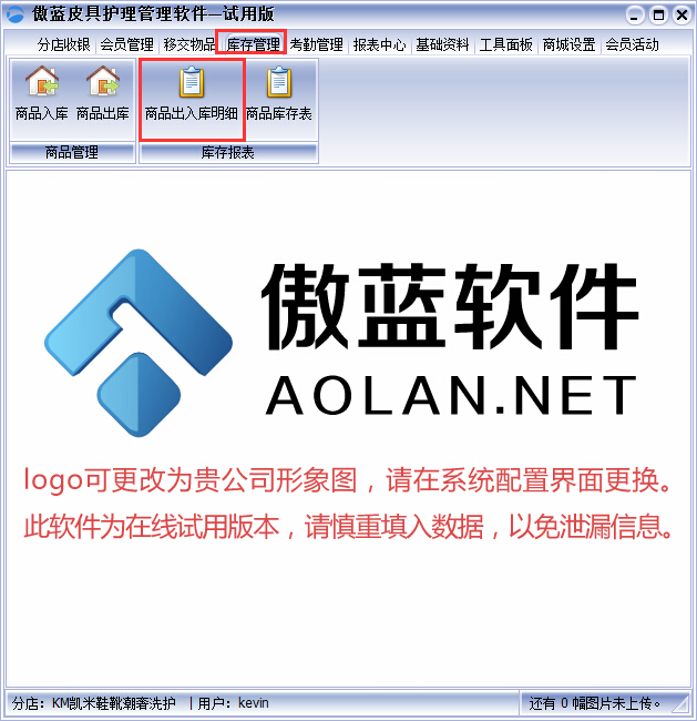 點擊傲藍皮具護理店管理系統中導航欄的庫存管理可以看到商品出入庫的明細:擊①【庫存管理】②【商品出入庫明細】,如圖: