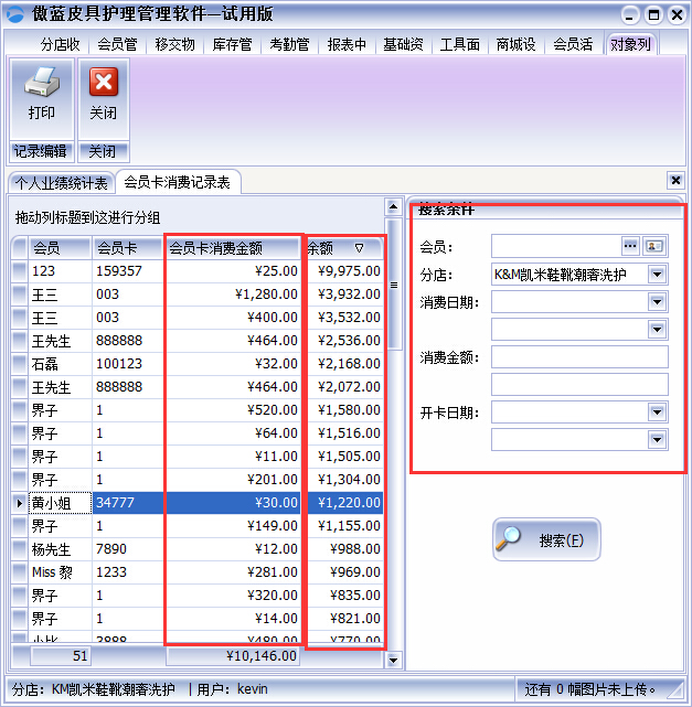 傲藍皮具護理會員管理軟件會員卡消費記錄表,實現(xiàn)會員卡充值后的消費情況,消費明細功能,幫助店鋪及時了解店鋪會員卡內(nèi)的余額及消費情況。