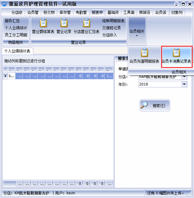 1、打開傲藍皮具護理門店管理軟件,點擊【報表中心】欄目,找到【會員相關】下的“會員卡消費記錄表”如圖: