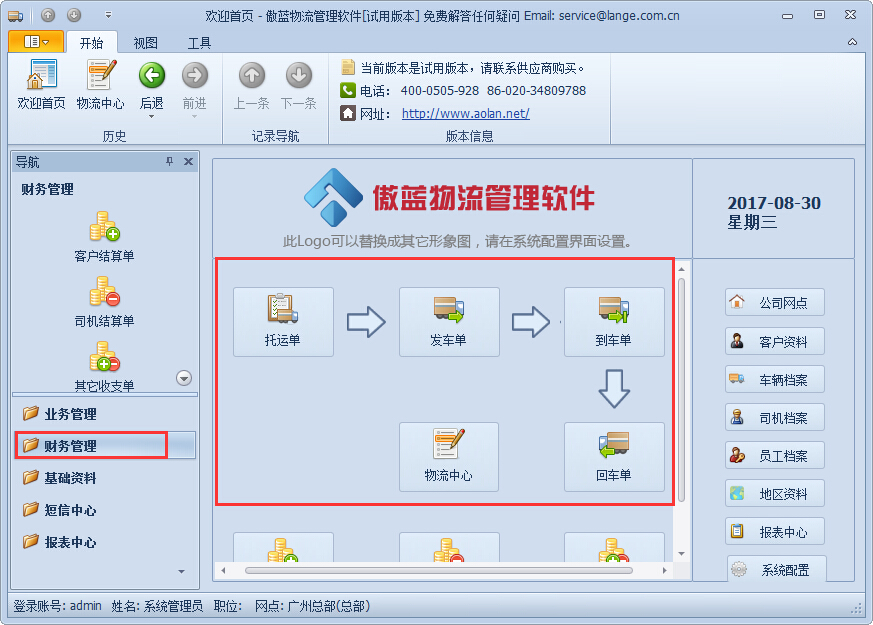 傲藍物流管理系統既是物流全流程管理軟件,也是公司的財務管理軟件, 流程完備,依據物流邏輯設置了嚴謹的運作流程,審核流程;收入管理,專門設置了財務管理流程,不會遺漏每一分錢。 運輸管理系統和財務系統深度契合,所有財務數據都來自于運輸體系,每一個數據都可以追溯到運作源頭。每一筆支出都是可以查看到具體人員,合同,業務關系,驛虎將財務系統和運輸系統緊密結合在一起,功能更強大。