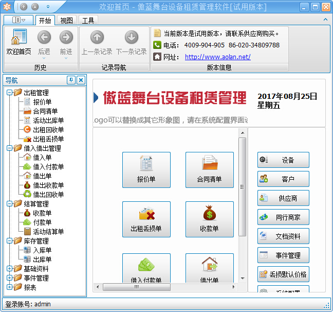 感謝您選擇并使用傲藍(lán)舞臺(tái)租賃管理系統(tǒng),為了您能盡快熟悉系統(tǒng)的操作流程,請(qǐng)?jiān)谑褂帽鞠到y(tǒng)之前仔細(xì)閱讀此操作說(shuō)明書(shū)。